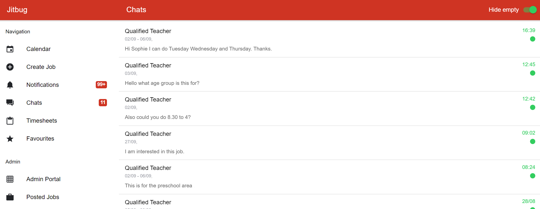 From the Notifications screen, you can respond to any job invitation or application without having to click through to see all the details. Same applies for submitting timesheets.